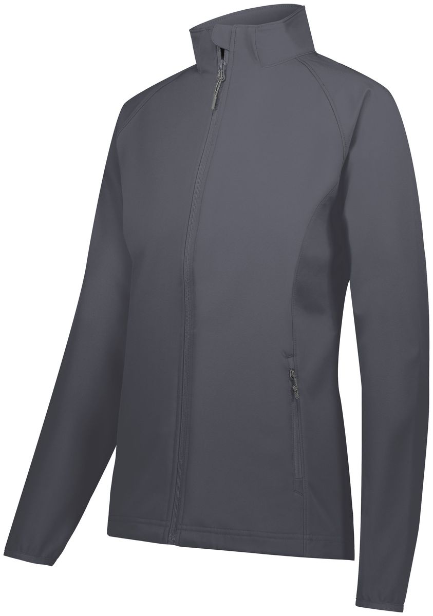 * Featherlight soft shell fabric is 100% bonded polyester with mechanical stretch and durable water-repellent finish to keep you dry * Wicks Moisture * Water-resistant * Ladies' fit * Woven label * Front zipper with outside storm flap and snaps * Raglan sleeves * Front zippered pockets * Dual inside pockets * Spandex bound cuffs * Open bottom with adjustable elastic hidden drawcord